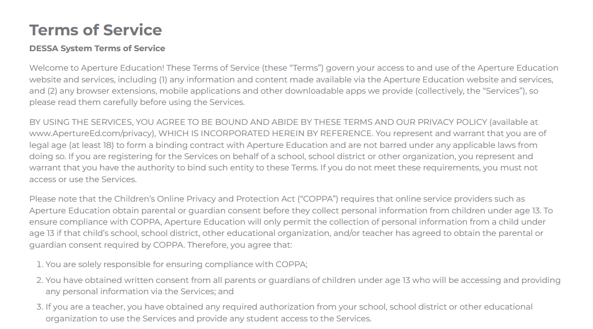 For customers looking to find Aperture Education's most recent Terms of Service, the full version can be reviewed using the following link: https://apertureed.com/terms-of-service/.
