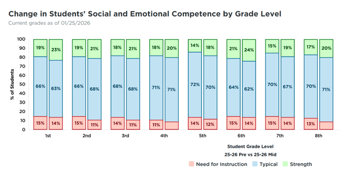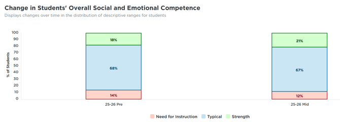 The Change in Students' Overall Social and Emotional Competence (Image 1) at the top shows the distribution of students across the three descriptive ranges for each of the rating windows: