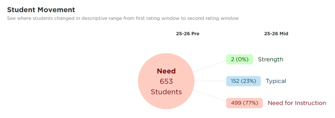 The Student Movement charts (Image 2) display how students who started in a particular descriptive range, such as Need for Instruction, moved to another descriptive range category in the second rating window: