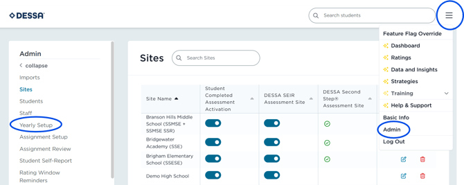 Configuring Conditional AssessmentsTo configure the DESSA System to prompt users to complete a follow-up assessment, navigate to the Admin menu, then choose Yearly Setup.