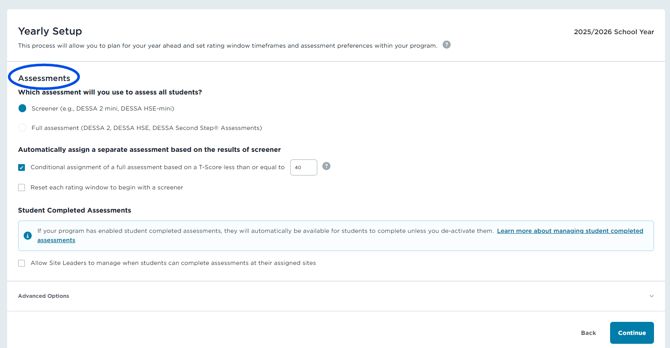 Once in Yearly Setup, press Continue to move past the How many times would you like all students to be assessed this school year? and When do you want your rating windows to begin? screens, stopping on the Assessments screen.