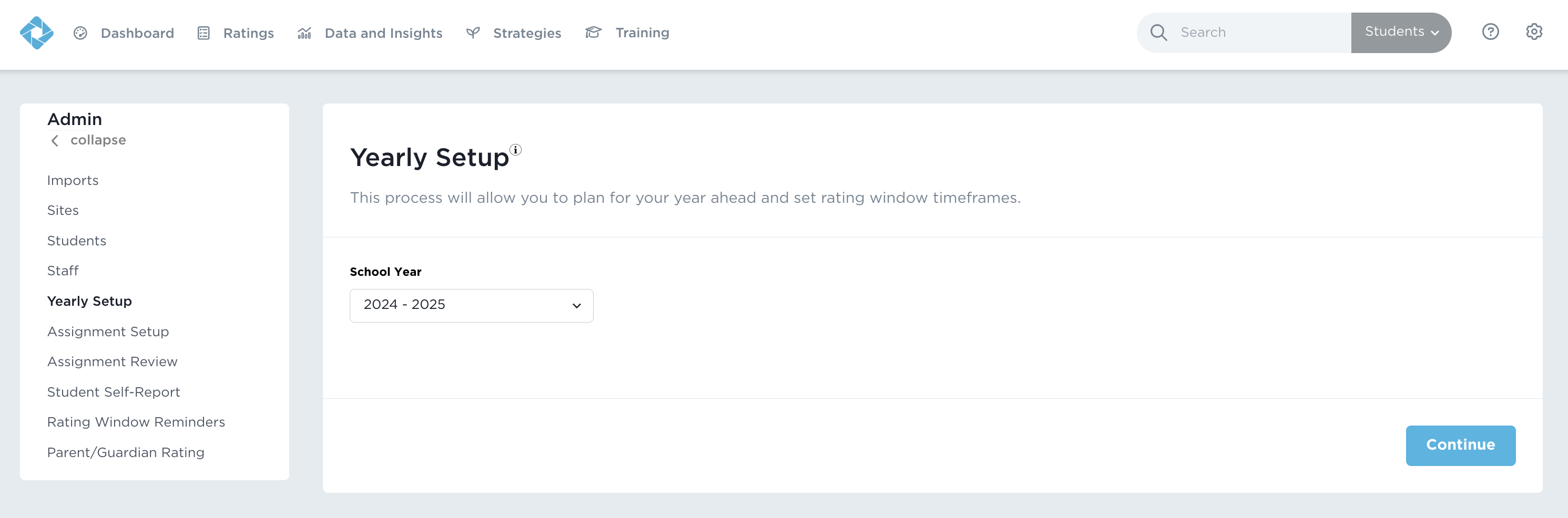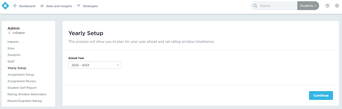 Press Continue to move past the How many times would you like all students to be assessed this school year? and When do you want your rating windows to begin? screens, ending on the Assessments screen (Image 2).