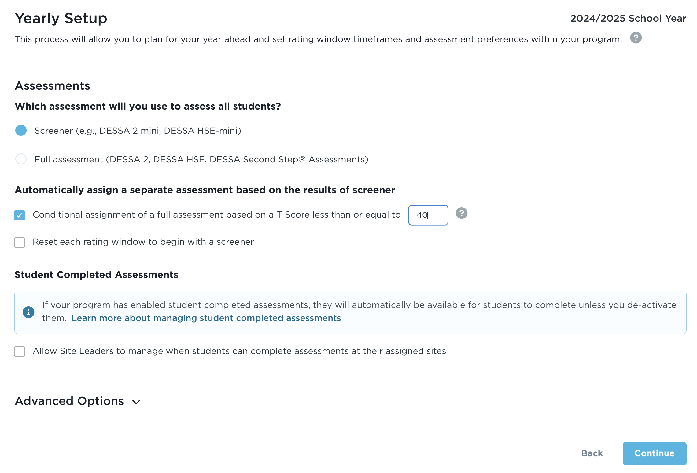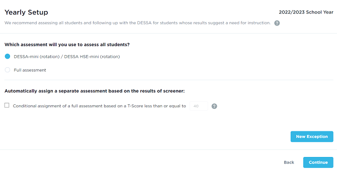 To automatically assign a separate assessment based on the results of a screening assessment, check the checkbox labeled Conditional assignment of a full assessment based on a T-Score less than or equal to. The T-Score default to trigger a conditional assessment is 40, but this can be changed by entering a different number in the box. Press Continue to save any changes.
