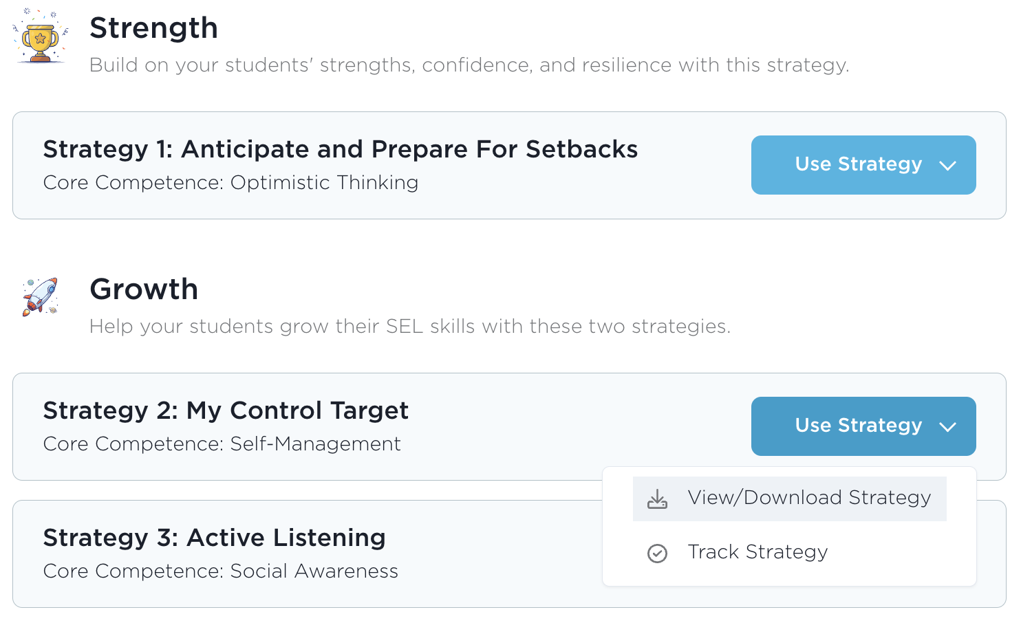 Based on the selected group of students' full DESSA data, three strategy recommendations will be presented (See Image 1). The first strategy is based on students' strengths, and the second and third strategies will help you build students' growth in lower-scoring competencies. By selecting Use Strategy, you can View/Download Strategy and Track Strategy, allowing you to access the strategy and track your plans for implementing each strategy.