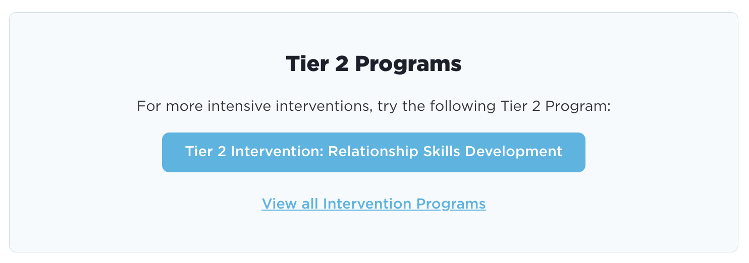 You will also receive one Tier 2 Intervention Program recommendation (See Image 2). These are multiweek programs designed for small group interventions. Each program is designed to be facilitated over a 4-8 week timeframe, depending on the focus area. The sessions are designed to be facilitated in about 30 minutes, with 3 lessons facilitated per week.