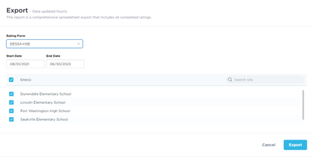 You will need to repeat steps 1-6 listed above for each rating form using the same date range and the same sites you previously selected. (For example, to get the rating completion for DESSA K-8 assessments, you will need to export both the DESSA-mini and full DESSA forms. Similarly, to get rating completion for teacher-administered DESSA High School Edition assessments, you will need to export both the DESSA-HSE mini forms and full DESSA-HSE forms.)