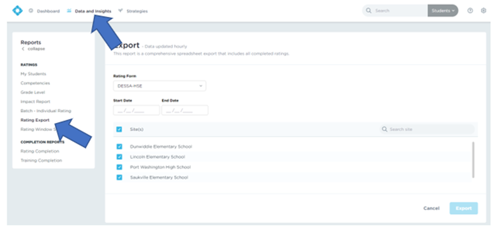 1. Click on Data and Insights on the top menu, then Rating Export on the left menu. (See Image 1)