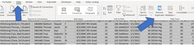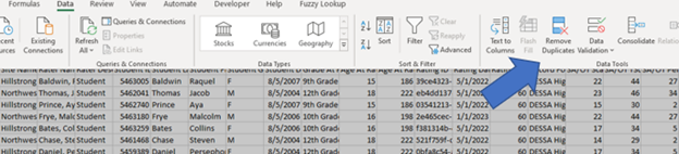 8. Once the data has been compiled into one file, you will need to remove the student’s duplicate records. Highlight all of the data, then click on Data from the top toolbar and click on Remove Duplicates. (See Image 4)
