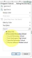 12. Total Number of Students (Site): To find the total number of students rated at each site, you will need to filter by site. Highlight the site_name column by clicking above the column. Click on Data from the top toolbar and click on Filter. (See Image 7)