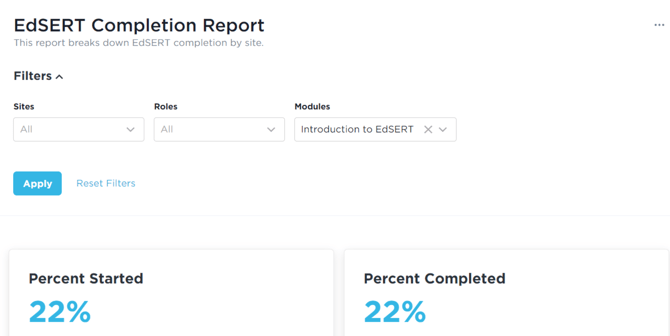 The EdSERT Completion Report displays your EdSERT completion percentage and status by individual educator. You can filter the completion results by specific modules to track participation.