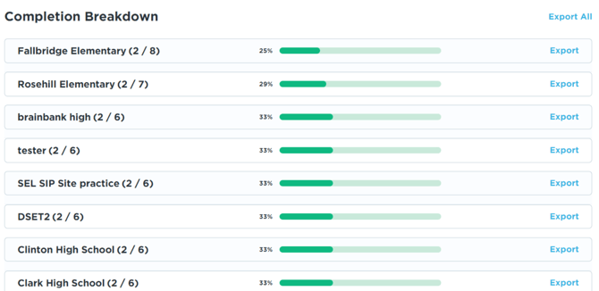 Admins also have the option to see a breakdown of the completion by site at the bottom of the page and this data can be exported as a .csv file for all sites or for an individual site. This section is titled Completion Breakdown. See Image 2.