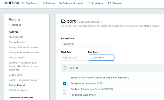 This article explains that only active students will have their ratings show up in the DESSA System and students removed from the system will only have their ratings visible through a Rating Export unless their account is restored using the same Student ID. It also explains how to run a Rating Export with step-by-step instructions.