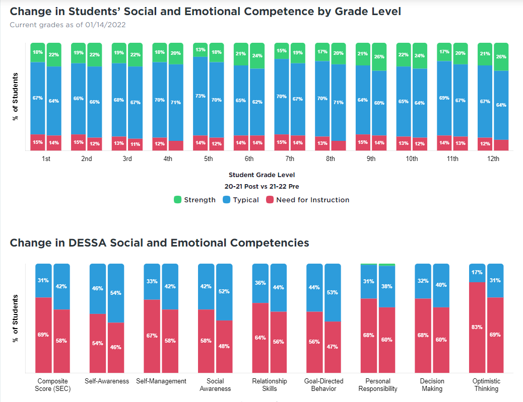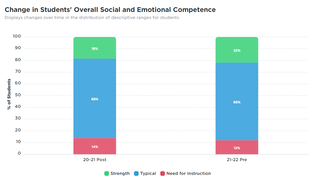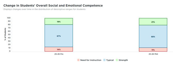 The Change in Students' Overall Social and Emotional Competence (See Image 1) at the top shows the distribution of students who have ratings in both rating windows being compared across the three descriptive ranges: