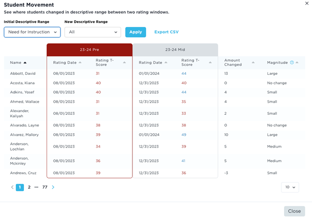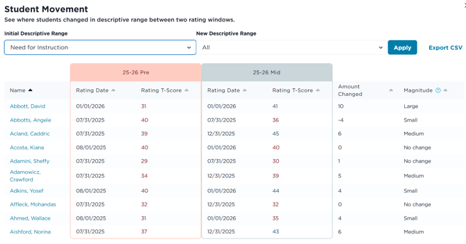 The student movement report provides a detailed view of the changes in students’ overall T-scores and descriptive ranges between two rating windows. It can be filtered by an initial descriptive range (from the first raging window included in the Impact Report) and/or a new descriptive range (from the second rating window included in the Impact Report.