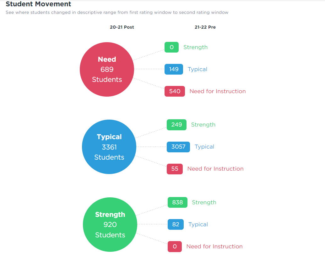 The Student Movement charts (See Image 2) display how students who started in a particular descriptive range, such as Need for Instruction, moved to another descriptive range category in the second rating window:
