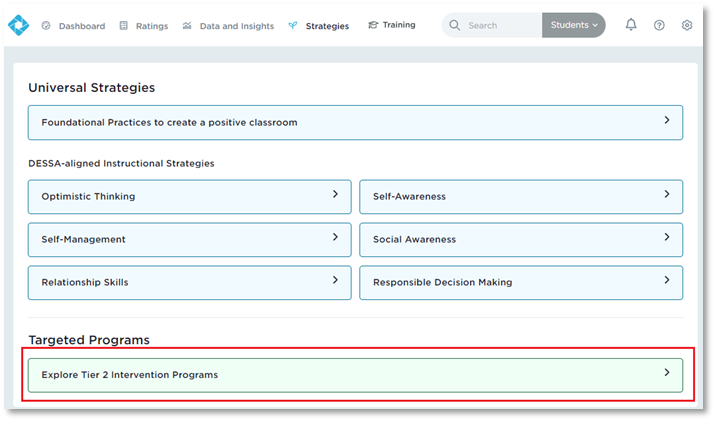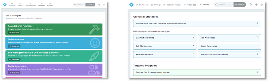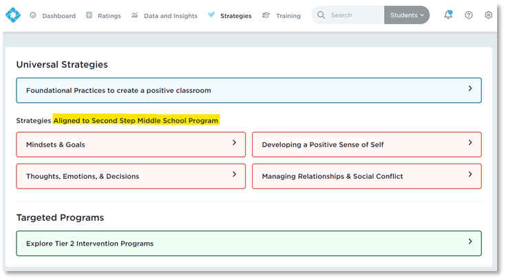 Users at sites which use the DESSA Second Step® Assessments, which are aligned to the popular Second Step® curriculum, will see Aperture’s instructional materials aligned to the Second Step® instructional units instead of the DESSA competencies. This will make it easier for DESSA Second Step® Assessment users to know which strategies support their students.