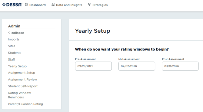 In the DESSA System, ratings can be completed in a given rating window anytime before the next rating window opens. There is no end date to select within the Yearly Setup for a rating window. You can select from one to five rating windows, depending on how you configure your school year. You will adjust the span of a rating window based on when the next rating window begins.