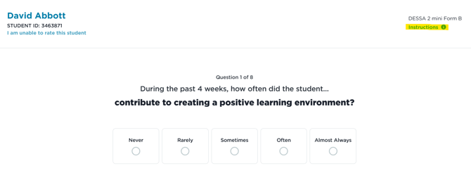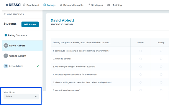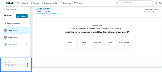 We recognize that Raters have different preferences when completing ratings. You can choose to complete the DESSA using either a table view or a single question view. The steps below outline how to switch between these two options.