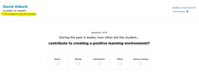- If this student should not be in your Rating List or has not been observed for the minimum 4-week period. Select I am unable to rate this student.
