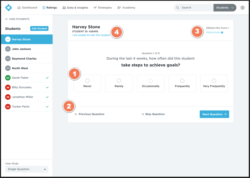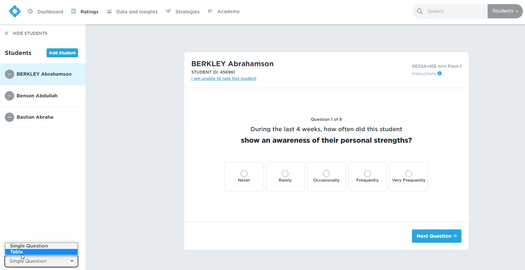 Currently, raters complete the DESSA in a table view form. However, we know it may be preferable to view one question at a time. With this update, raters have the choice to keep conducting ratings in the traditional table view, or switch to the single question flow.