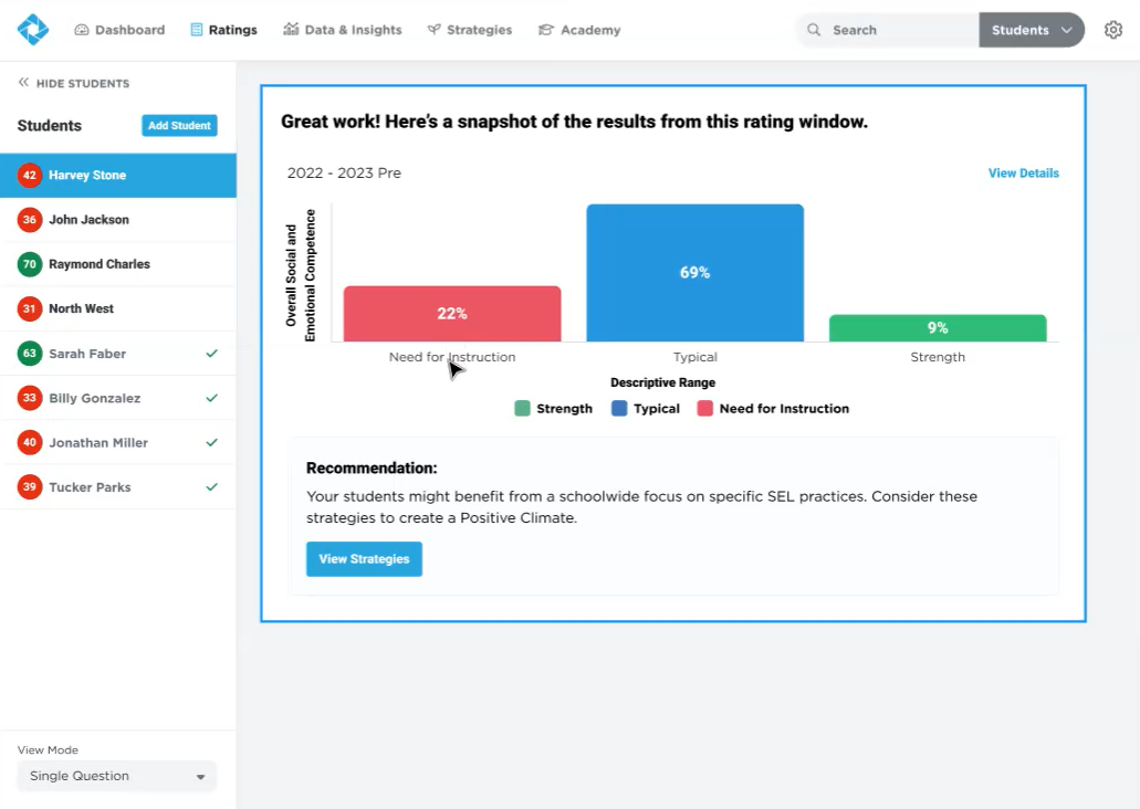 - A View Strategies option which, based on the distribution of students in your Rating List, provides a specifically tailored Strategy based on your classroom makeup.