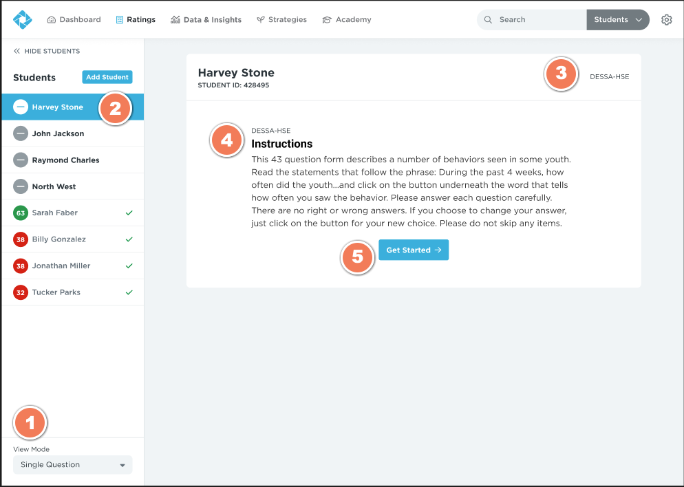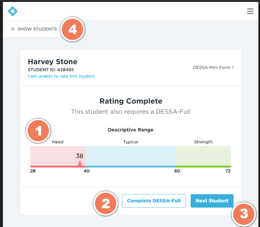 3. Now select the student's name (#2 on Image 1), where you will see which DESSA form you will be completing (#3 on Image 1) along with the instructions for completing your rating (#4 on Image 1).