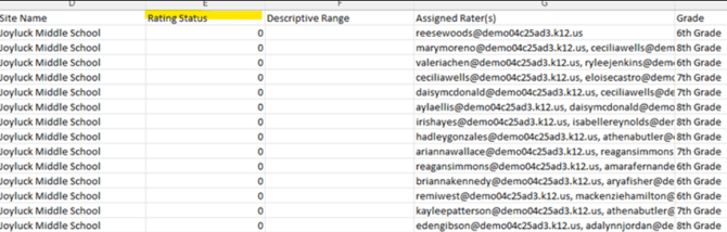 - The .csv export displays one line per student and there may be multiple raters shown in the Assigned Rater(s) column.