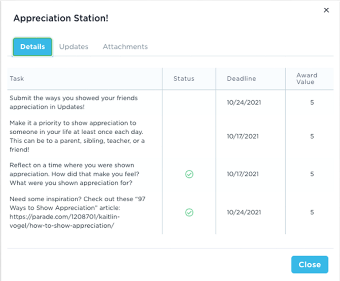 6. Under the Details section of each Goal or Challenge, you can see a detailed summary of how many tasks have been completed by the student (Image 3).